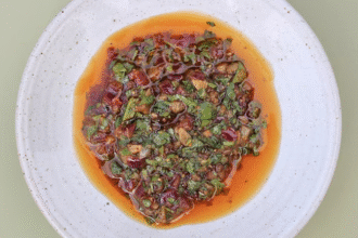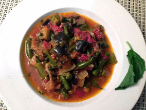 “Batilgian” means eggplant in Armenian. This vegetarian stew, featuring purple eggplant as its star ingredient, offers a lighter alternative to Provençal ratatouille. It can be served hot as a satisfying main course or cold as a refreshing side dish. Remarkably, its flavors deepen overnight as the ingredients meld together, creating a richer, more complex taste.